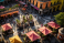 Spectacular Aerial View of Vibrant Plaza with Colorful Canopies and Bustling Crowds