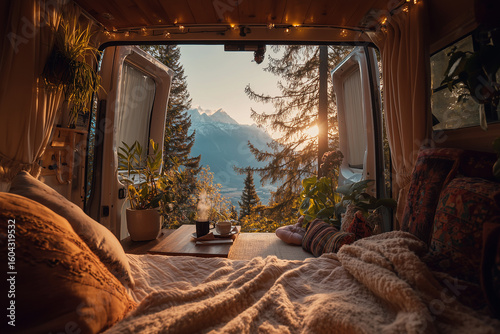 >Naklejka na meble>Przeznaczenie>Salon>Przytulne miejsce wypoczynkowe w kamperze z wygodną kanapą, dekoracjami i dużymi oknami ukazującymi malownicze widoki natury w tle.