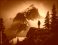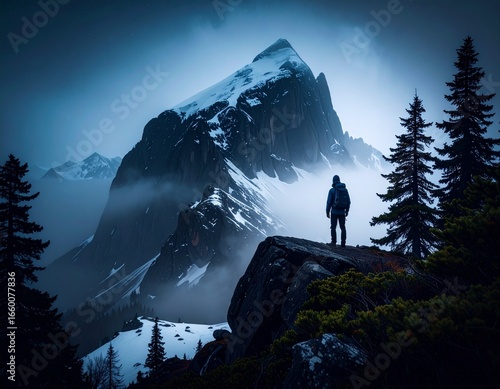 Mroczny, zamglony, górski krajobraz z wędrowcem który stoi na skale i podziwia widoki