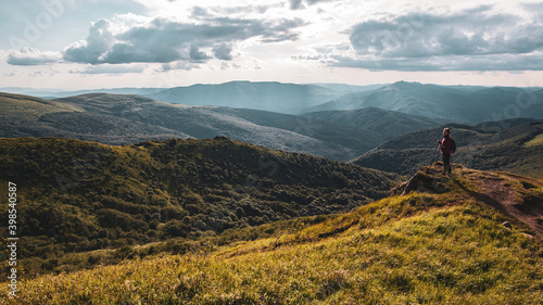 Fototapeta - Turystka podziwia panoramę Bieszczadów widoczną po zachodniej stronie Bukowego Berda, Bieszczady, Polska,