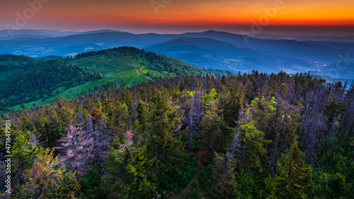 Fototapeta - Widok o wschodzie słońca z wieży widokowej na górze Gorc