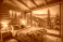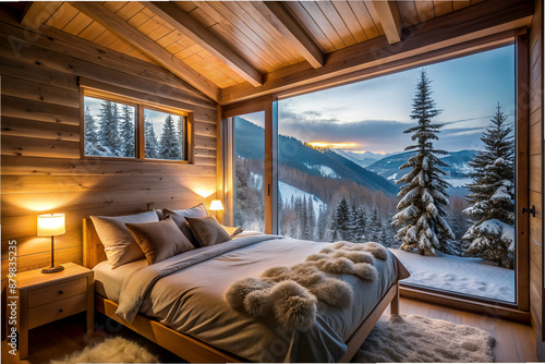 >Naklejka na meble>Przeznaczenie>Salon>A cozy bedroom with a large bed and a window overlooking a snowy mountain. The room is lit by a warm, inviting light, creating a peaceful and relaxing atmosphere