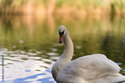Fototapeta - Łabędź niemy na spokojnej wodzie w świetle dnia