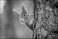 Curious red squirrel peeking behind the tree trunk