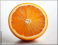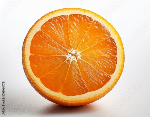 Close up de una naranja partida por la mitad aislada en fondo blanco