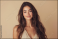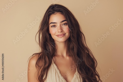 >Plakat>Elegant 30s Latina woman with long wavy hair, wearing a fashionable dress, smiling subtly. Portrait on solid beige background. Ideal for fashion brands, beauty products, lifestyle magazines.