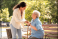 Fototapeta - Young African-American female medical worker helping elderly woman outdoors