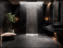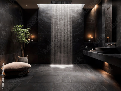 >Plakat>Chuveiro amplo em um banheiro elegante e minimalista. A atmosfera escura e intimista convida ao relaxamento e à introspecção, proporcionando uma experiência de spa em casa