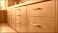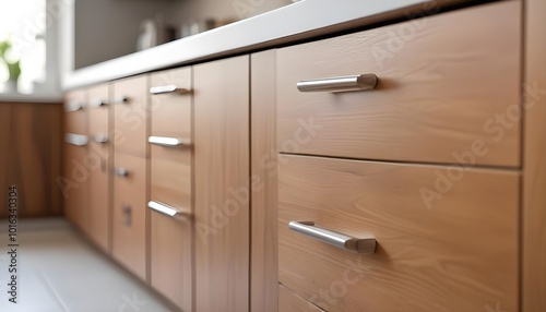 Fototapeta - Wooden cabinets with silver handles against a blurred background