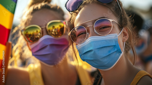 Fototapeta - Na parady równości, pośród tłumu wesołych uczestników, znajduje się dziewczyna, której twarz jest głównym punktem zainteresowania.
