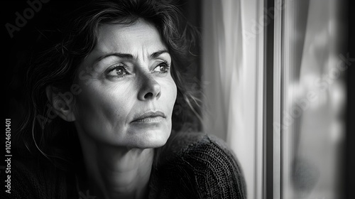 Fototapeta - ubóstwo, kobieta, portret, refleksja, czarno-białe, okno, myśl, powaga, ubóstwo, trudności życiowe, realistyczne, wyraz twarzy, Canon EOS R5, f/1.6, fotografia z bliska, empatia, walka, refleksja nad