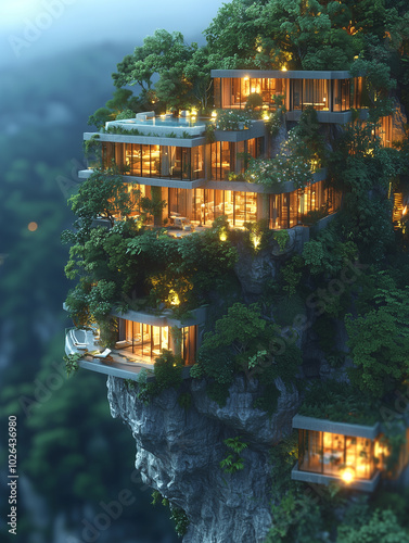 >Plakat>Osadzone na klifie, nowoczesne domy o geometrycznej bryle z przeszklonymi ścianami. Ich fasady zdobi zieleń, a wnętrza rozświetla ciepłe światło.