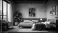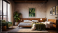 >Plakat>nowoczesny salon z dużymi oknami i dużym stołem na środku, stylowy wystrój, ciemne, ziemiste kolory, głębokie, ziemiste kolory, kolory ziemi, spokojny i cichy styl