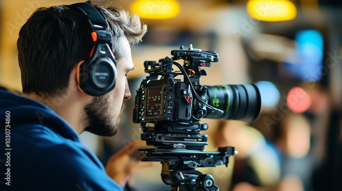 Fototapeta - Operator kamery w pełnym skupieniu, który rejestruje dynamiczne wydarzenia na planie filmowym.