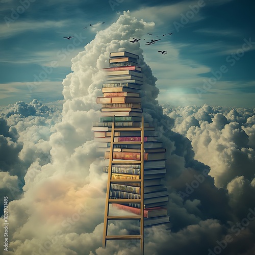 Fototapeta - A dreamlike surrealist image depicting a tall stack of books reaching into the clouds, with a ladder leaning against them. Birds soar around the tower, symbolizing the boundless