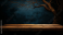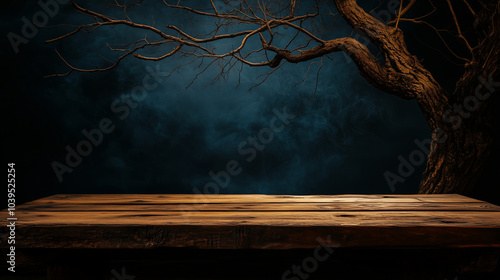 Fototapeta - Stary, zużyty drewniany stół z wyraźnymi śladami użytkowania zajmuje centralne miejsce w mrocznej scenerii.
