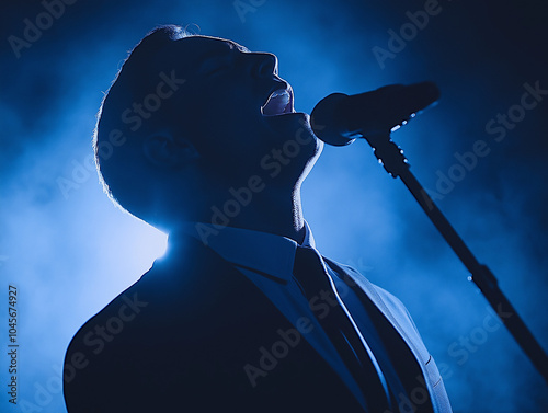 Fototapeta - Młody mężczyzna śpiewający do mikrofonu.
