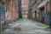 A narrow alleyway with graffiti on the walls and a few trash cans
