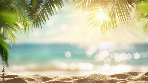 Fototapeta - Abstract blurred background featuring a tropical beach scene with sunlight rays Golden sand clear water and palm leaves under a bright sky create a summer vacation vibe Copy space available
