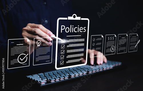 Fototapeta - Policy documentation and compliance concept. A person reviews digital document labeled "Policies" with icons, checklists, certifications, and financial detail. policy management, regulatory compliance