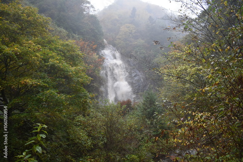 Misty waterfall cascading down rocky terrain surrounded by lush green and vibrant autumn foliage The scene is shroude
