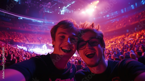 Fototapeta - Dwóch młodych mężczyzn, którzy z uśmiechami na twarzach pozują na tle rozświetlonej sceny w ogromnej hali koncertowej.