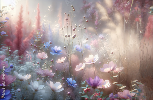 Fototapeta - A serene and enchanting landscape of colorful flowers, delicate grasses and a gentle mist.