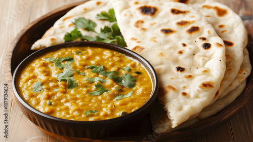 Fototapeta - Porcja aromatycznego dal curry, serwowana z naanem, zachęca głębokimi, pikantnymi smakami