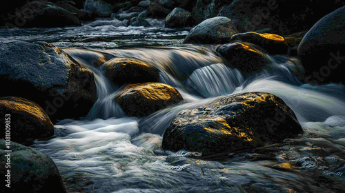 Woda płynie delikatnie po gładkich, ciemnych kamieniach, tworząc harmonijny kontrast między jasnym nurtem a kamienistym podłożem.