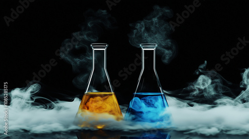 Fototapeta - Dwie chemiczne kolby z barwnymi płynami w centrum ujęcia, otoczone wirującym dymem.