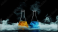 Dwie chemiczne kolby z barwnymi płynami w centrum ujęcia, otoczone wirującym dymem.