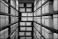 Indoor storage details in a manufacturing enterprise, black shelves with white office boxes.
