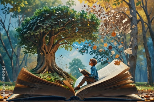 Fototapeta - Niño sentado en un libro enorme, leyendo un libro. Dentro del libro enorme hay un árbol. Representa la imaginación del lector.