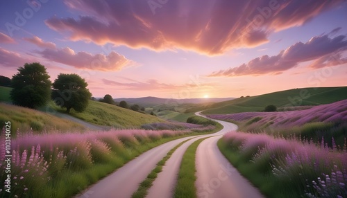>Plakat>Un camino largo y sinuoso que se extiende a lo lejos bajo un colorido cielo al atardecer con nubes. El camino está rodeado de frondosos árboles verdes y vegetación a ambos lados