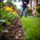 Gardener edging flowerbed with bright orange and yellow blooms in lush backyard