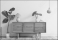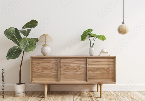 Fototapeta - Wooden cabinet with plants and lamp on white wall background