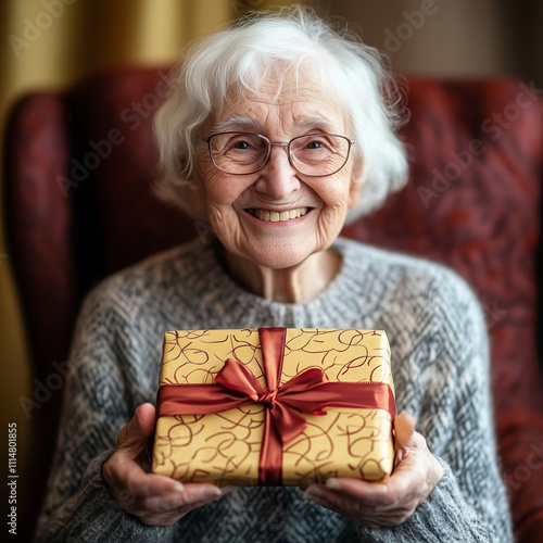 Fototapeta - Starsza Kobieta trzyma w rękach prezent - Dzień Babci
