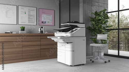Fototapeta - Fotokopiarka nowej generacji, łącząca funkcje skanowania i drukowania, stoi w modernistycznym biurze.