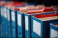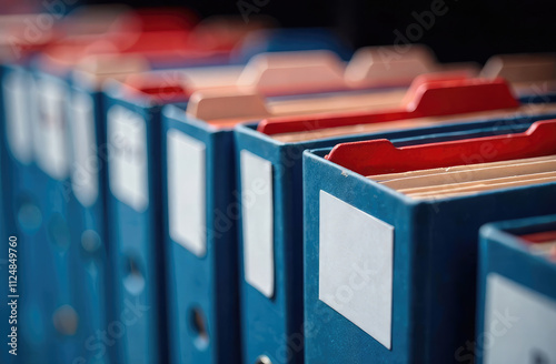 Organized archive with ring folders in a row, one red folder, the rest blue: archive, database and search concept