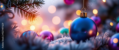 >Plakat>Błyszczące fioletowe, zielone i różowe ozdoby świąteczne zawieszone na oszronionych gałęziach wiecznie zielonych drzew na tle miękkiego efektu bokeh.