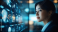 >Plakat>A woman in a modern office setting is deeply engaged with futuristic digital screens filled with intricate data, portraying a blend of technology and dedication in work.