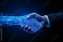 >Plakat>A digital handshake blending human and technology with glowing circuit board patterns, futuristic style, dark background, concept of innovation. Ai generative