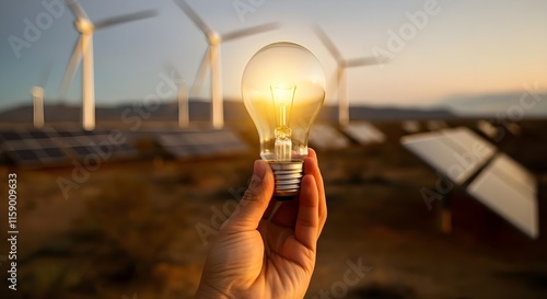 "Innovation Concept: Hand Holding Light Bulb in front of Wind Turbines"