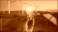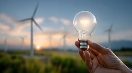 A hand holds a lit bulb at sunset, with wind turbines behind, symbolizing sustainability