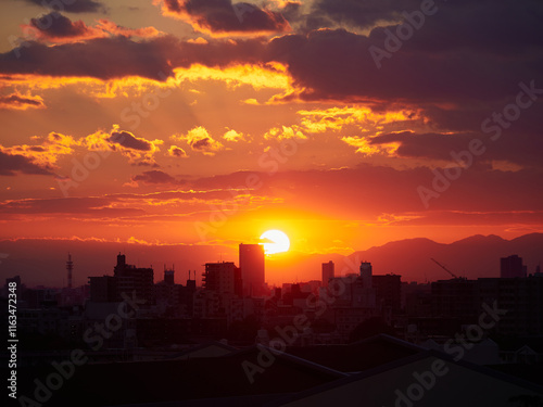 Fototapeta - 鮮やかな夕日の風景と名古屋市の街並みの様子