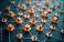 >Plakat>Miniature figures representing employees connected via network of lines. Interact in groups around glowing hubs. Decentralized communication system suggests collaboration, partnership within business