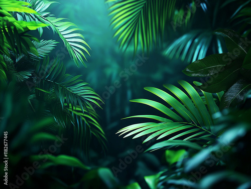 Tropisches Blattwerk mit satten Grüntönen und mystischer Lichtstimmung