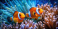 Fototapeta - A vibrant orange and white clownfish amidst blue floral underwater scenery.