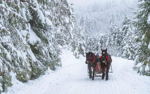 Fototapeta - para koni ciągnie sanie w zimowej górskiej scenerii
