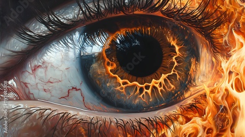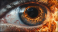Fototapeta - fotorealistyczne, realistyczne, zdjęcie, obraz, bliskie ujęcie, zbliżenie, szczegółowe, detale, ogień w oku, płomień w oku, realistyczny ogień, wyraziste detale, teksturowana powierzchnia, hiperrealiz